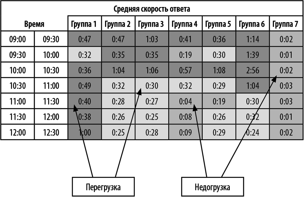 Таблица 6.2. Пример распределения средней скорости ответа по получасовым интервалам для нескольких групп