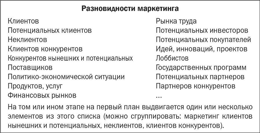 Объем и направленность книги не позволяют слишком углубиться в проблемы маркетинга, но не могу не сказать о том, что кроме маркетинга рынка, клиентов и новых технологий есть еще множество разновидностей маркетинга.