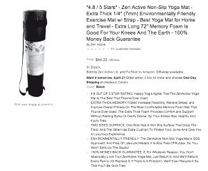 Что я знал о товарах для йоги? Ничего. Я просто взял товар, который нужен рынку, и произвёл его силами стороннего производителя. Затем, когда мы нашли товар, который нас устроил, наш производитель отправил товар прямиком на склад Amazon. Мы создали страницу товара на Amazon – листинг. Вот скриншот этого листинга на одной из ранних стадий: