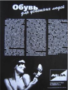 – определение смысла в контексте (первый абзац). Цель этого этапа – встроить рекламируемый объект в уже имеющийся в сознании потребителя товарный миф. На этом этапе сообщается о том, что на российском обувном рынке итальянская марка «ALBA» появилась в 1993.
