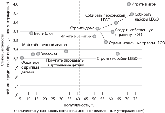 Специалисты LEGO также изучили, чего ждут дети (их клиентское ядро) от онлайн-среды. Рис. 6.3 иллюстрирует результаты адаптивного диалога с оценкой популярности и степени важности идей, предложенных детьми в ответ на поставленные вопросы. Благодаря этому процессу в LEGO узнали любопытный факт: маленьким клиентам интересно создавать различные конструкции как из физических, так и из виртуальных деталей. Компания сможет использовать эту ценную информацию при разработке новых интернет-продуктов, чтобы привлечь еще больше детей к игре с конструкторами LEGO в интернете.