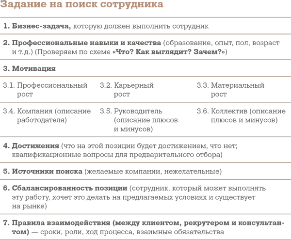 Когда все требования к кандидату (в том числе его предполагаемая мотивация) определены и понятны всем участникам процесса, их непременно нужно зафиксировать в письменном виде. Если в поиске участвуют несколько человек, этот документ впоследствии позволит избегать разночтений. Но даже если поиск ведется единолично, полагаться на память не стоит. Техническое задание будет полезно как для самопроверки, так и при проведении интервью (в сущности, оно станет своеобразной заготовкой, на основе которой несложно составить список вопросов для кандидатов). Форму, в которой будет записано задание на поиск, вы можете разработать сами – или же воспользоваться вот таким бланком: