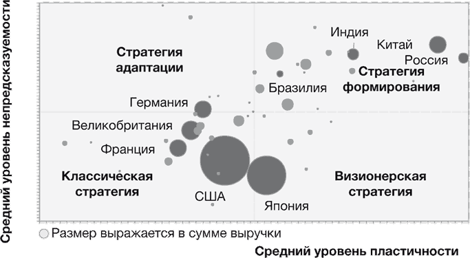 Рынки развивающихся стран, таких как Китай и Индия, одновременно непредсказуемы и пластичны: отрасли только начинают развиваться, достаточно слабо регулируются, число ведущих игроков невелико, а темпы роста при этом высокие. Как показал наш анализ, развивающиеся рынки как минимум в два раза более непредсказуемы и пластичны, чем развитые. На развивающихся рынках сильна зависимость от экспорта и прямых иностранных инвестиций. На них сильно влияют колебания цен на сырье и валютных курсов, изменения демографической ситуации, структуры спроса, регулирования, моделей конкуренции и темпов роста (рисунок 5–2).