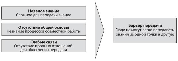 Люди сталкиваются с трудностями в передаче опыта, ноу-хау и технологий, когда, работая в разных подразделениях, не знают, как взаимодействовать сообща. Барьер передачи связан не с мотивацией, а с возможностями: люди могут быть высокомотивированными на совместную работу, но такая работа сложна для них.