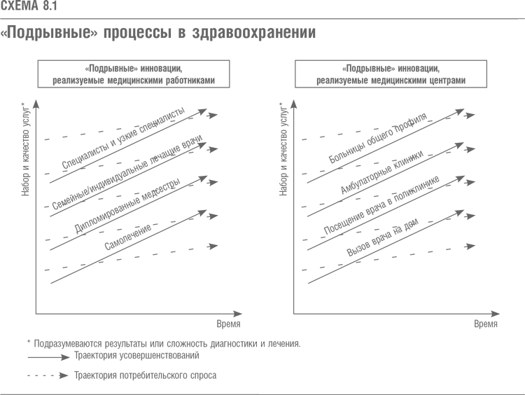 «Подрывные» инновации, реализуемые медицинскими работниками, сначала напоминают традиционные «подрывные» инновации, ориентированные на новые рынки. Они позволяют лечить больше пациентов, так как менее квалифицированный медицинский персонал получает возможность обслуживать «непотребителей». Медики начинают лечить пациентов, чьи болезни еще не развились настолько, чтобы с ними можно было обращаться к специалистам высокой квалификации.