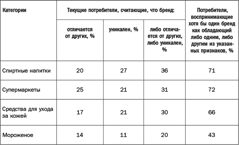 Таблица 8.2. Восприятие дифференциации бренда его потребителями в категории безалкогольных напитков (Великобритания) и в категории банковских услуг (Австралия)