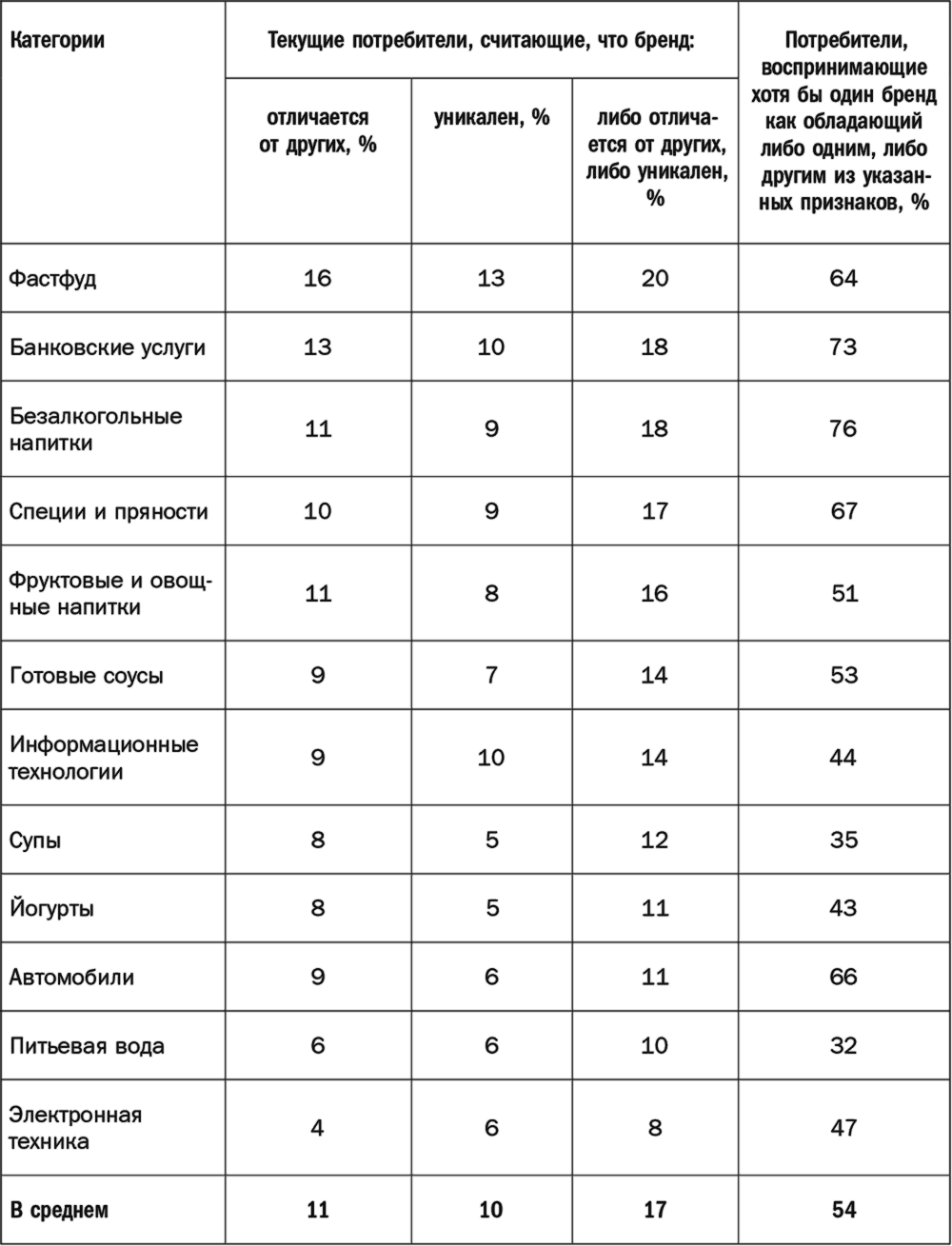 На всех изученных нами рынках, независимо от того, пользовались мы собственными данными или сторонними, четко обозначается похожая закономерность: в среднем около 10 % пользователей любого бренда считают, что он отличается от других. Вполне могло быть, что полученные результаты отражают безразличие респондентов, отвечавших на вопросы в анкетах. Однако есть три свидетельства, что это не так. Во-первых, на исследованных рынках существуют необычные бренды с очевидными функциональными отличиями от других. Например, супермаркеты Aldi, в ассортименте которых отсутствуют национальные бренды, получили 67 % ответов по показателю «отличается от других»; тогда как в категории фастфуда бренд Subway, предлагающий исключительно сэндвичи, был отнесен к разряду «уникальных» в ответах 50 % респондентов (когда его поместили в одну конкурентную группу с брендами McDonald’s, Domino и KFC). Таким образом, респонденты были вполне в настроении отреагировать, если им встречалось что-то, воспринимаемое как отличающееся от остального. Однако большинство брендов редко позиционировались ими как явно отличающиеся. Во-вторых, в ответах респондентов нашли отражение различия в категориях. В-третьих, результаты анкетирования показали ожидаемые различия между разными рынками; например, что безалкогольные напитки намного более дифференцированы, чем питьевая вода. И еще: по результатам исследования, в категориях спиртных напитков и средств по уходу за кожей – а они были намеренно выбраны как категории, где имидж бренда первостепенен и где на рекламу тратятся огромные средства, – уровни восприятия различий брендов оказались одними из самых высоких (хотя все равно низкими).