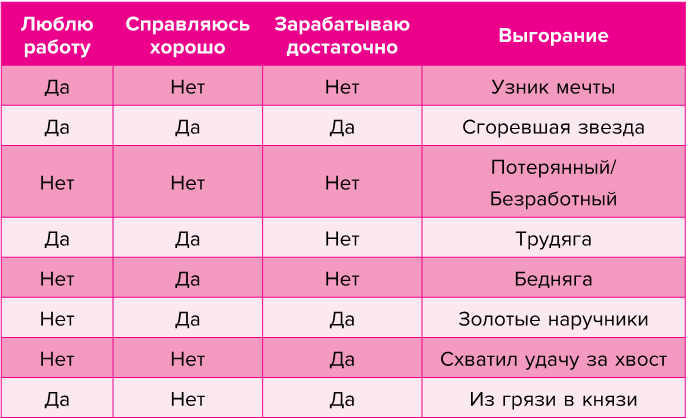 Существует восемь типов выгорания. Отсутствие одного, двух или всех трех факторов в работе человека приводит к разному типу выгорания. Но даже при наличии всех трех факторов (любовь к работе, умение ее делать и достойная заработная плата) выгорание все же возможно и носит определенный характер.