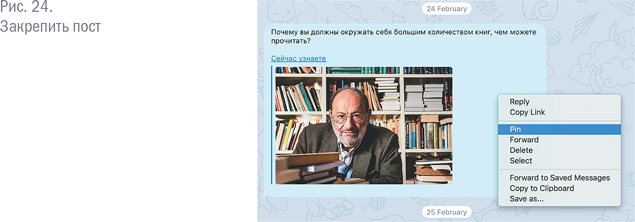 Как и в паблике во «ВКонтакте», на Telegram-канале администратор может закрепить тот или иной пост. Для этого достаточно кликнуть на публикацию правой кнопкой мыши (если вы работаете через десктоп) или просто зажать пост (в случае с мобильным устройством), а затем нажать в выпадающем меню на «Закрепить» (Pin).