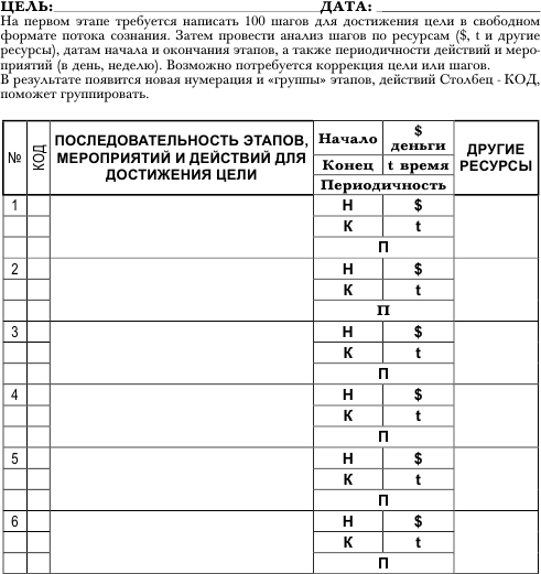Как только выбраны направления развития (ЖП) и сформулирована цель личного успеха, мы переходим к следующему этапу, который называется «План личного развития» (см. таблицу 21). В соответствие с долгосрочной целью успеха необходимо написать сто шагов, которые нужно сделать, чтобы ее достигнуть. Причем цель может быть выставлена на год, на два, на три, на пять лет – здесь абсолютно не важен диапазон.