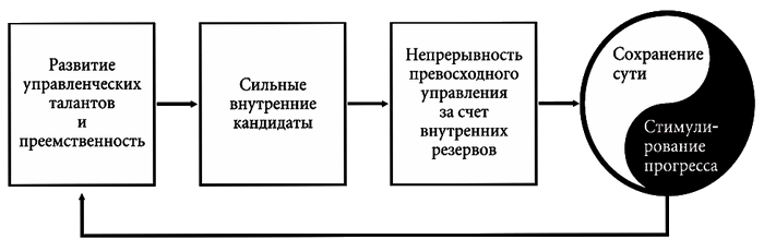 Не качество управления сильнее всего отличает великие компании от компаний сравнения. Значение имеет его преемственность, при которой сохраняется суть. И те и другие компании в определенные моменты истории располагали превосходными руководителями. Но в великих компаниях была преемственность и развитие управленческих талантов — ключевые компоненты часового механизма. Посему они обеспечивали непрерывность управления гораздо эффективнее, чем компании сравнения, за счет внутренних талантов в 15 из 18 пар (см. таблицу А.8 в приложении 3).