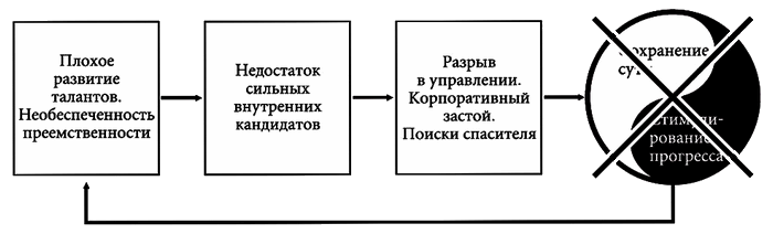Отсутствие хотя бы одного их этих компонентов нарушает непрерывность управленческой традиции и вынуждает компанию искать CEO за ее пределами и таким образом отклоняться от ключевой идеологии. Подобная прерывистость может препятствовать прогрессу, поскольку из-за неразберихи наверху компания на какое-то время замирает в неподвижности. В действительности у компаний сравнения отмечается манера поведения, противоположная принципам «непрерывного лидерского цикла» великих компаний. Мы назвали эту ситуацию «брешь в управлении и синдром спасителя»: