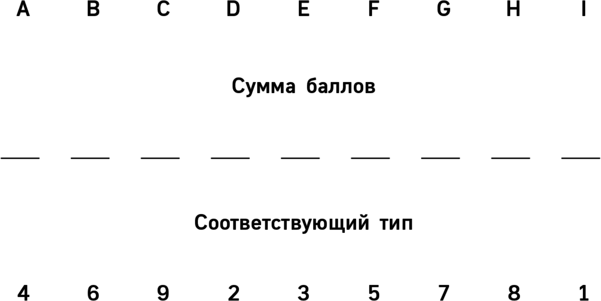 1. Перенесите баллы из строк «общий результат» внизу каждого раздела в соответствующие строки ниже. Например, сумма баллов из раздела «Тип личности А» должна быть записана в строке прямо под буквой А. Числа под строками на этой странице соответствуют типам личности по эннеаграмме. Наибольшая сумма баллов, как правило (но не всегда), указывает на ваш тип.