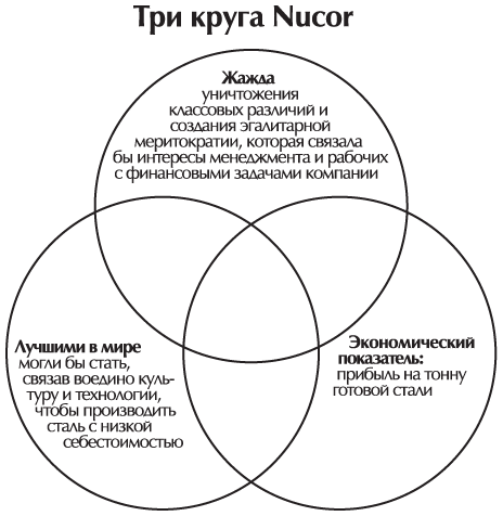 Кен Иверсон сказал, что практически 100 % успеха Nucor приходится на ее способность превратить простую концепцию в дисциплинированные действия, согласующиеся с ней. Nucor стала компанией с оборотом $3,5 млрд и попала в список Fortune 500, имея только четыре уровня управления и всего 25 человек в головном офисе, включая высшее руководство, финансовый отдел, секретарей и так далее; вся контора теснилась в арендованном офисе размером с зубоврачебный кабинет{261}. Дешевая фанерная мебель в холле, который сам был не больше шкафа. Руководство принимало дорогих гостей не в корпоративном обеденном зале, а в Phil’s Diner, маленьком кафе через дорогу{262}.