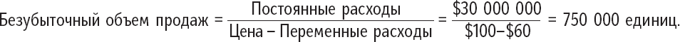 Самый простой метод понять эти причины и следствия и оградить себя от негативного воздействия на прибыль – анализ безубыточности. Используем цифры из примера с производителем станков. Цена $100, переменные затраты на единицу продукции составляют $60, а постоянные расходы $30 млн. Можно рассчитать безубыточный объем продаж, то есть минимальное количество единиц, которые нужно продать: