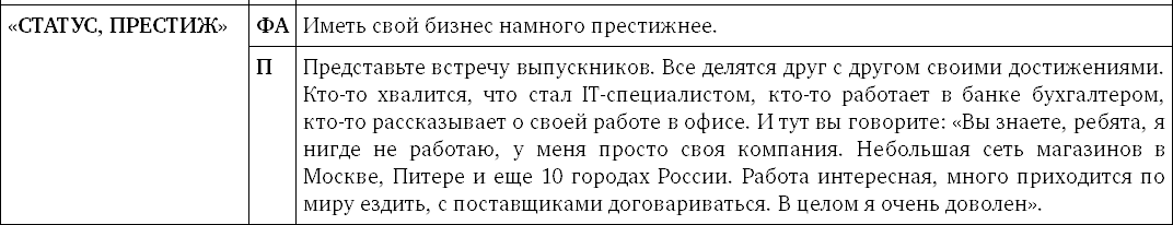 Теперь давайте подправим наши аргументы. Вспомним 8 аргументов, полученных в результате мозгового штурма. Вначале определим, какие философии из тех, что мы выработали, будут уместны в этом конкретном случае: деньги, время, свобода, самореализация, статус, престиж, комфорт, удобство, отдых. Допустим, мы изучили и проанализировали аудиторию и решили, что этим людям будут близки четыре философии: деньги, самореализация, свобода, статус/престиж.