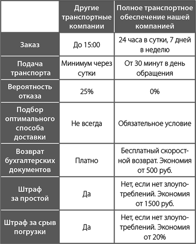 Этот прием мы использовали, когда создавали коммерческое предложение для клиента – транспортной компании. Были собраны убедительные аргументы и сформулированы выгоды сотрудничества. Чтобы потенциальный клиент лучше понял выгоды предложения, мы сравнивали «нашу» компанию с другими транспортными компаниями. Вот как выглядела сравнительная таблица. Обратите внимание, сравнивались важные для клиента показатели: скорость подачи транспорта, наличие штрафов и т. д.