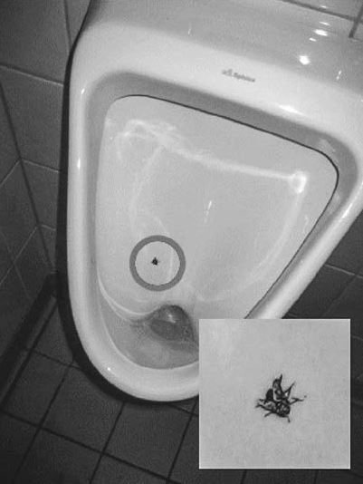 ? Уборщики туалетов в аэропорту Схипхол в Амстердаме устали вытирать последствия постоянных промахов рядом с писсуарами в мужских комнатах, поэтому задумались, как помочь пользователям наладить прицел. Решение пришло в виде картинки мухи в писсуаре. Первоначальное удивление от вида мухи провоцировало природный азарт выслеживания насекомого, в результате зона мужских писсуаров стала на 80 % чище (рис. 8.41) [287].