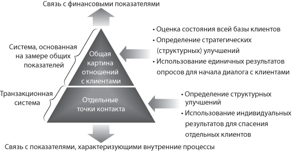Очевидно, что общий и транзакционный подходы имеют свои области применения. Оба метода можно использовать для стимулирования активных действий на всех уровнях организационной системы компании. При этом очень важно найти правильное сочетание различных типов обратной связи. Для большинства компаний оптимальный курс действий заключается в определении стратегических инвестиций и отслеживании состояния ключевых сегментов клиентов. Транзакционный подход позволяет получить более подробную информацию об операционной эффективности работы компании, а также своевременную обратную связь о конкретных потребностях клиентов по мере их возникновения. Сочетание этих двух методов обеспечивает комплексное представление об отношениях с клиентами, а также позволяет предпринимать необходимые действия как в рамках отдельных подразделений, так и в компании в целом.