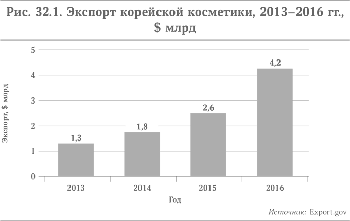 Суммы, которые тратятся в мире на корейскую косметику, поражают. По сравнению с 2015-м объемы производства и экспорта корейской косметики возросли в 2016 г. на 8,2 и 61,6 % соответственно. Вышеприведенный график иллюстрирует взрывной рост: если в 2013 г. объем экспорта косметики из Кореи составлял лишь $1,3 млрд, то в 2017 г. рынок корейской косметической продукции оценивался уже в $13 млрд. Исследовательская фирма Mintel прогнозирует устойчивый рост отрасли вплоть до 2020 г.