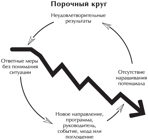 Компании, которые мы использовали для сравнения, вели себя совершенно по-другому. Вместо спокойного, взвешенного подхода, анализа того, что должно быть сделано, и претворения в жизнь намеченного эти компании пытались запустить новые программы, обычно с большим шумом и помпой, что должно было поднять боевой дух «в войсках», но, как правило, результаты этих программ не оправдывали ожиданий. Начальники пытались найти единственное действенное решение, выработать всеобъемлющую программу, сделать одно спасительное открытие, найти магический момент, который позволил бы пропустить тяжкий этап наращивания потенциала и выйти прямо к этапу стремительного роста. Они раскручивают маховик в одном направлении, затем останавливаются, меняют направление, снова толкают его, затем снова останавливаются и снова меняют направление. После многолетнего шарахания из стороны в сторону этим компаниям не удается накопить никакого потенциала, и они оказываются в ситуации, которую мы назвали «порочный круг».