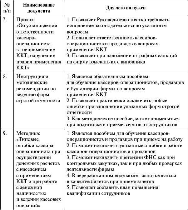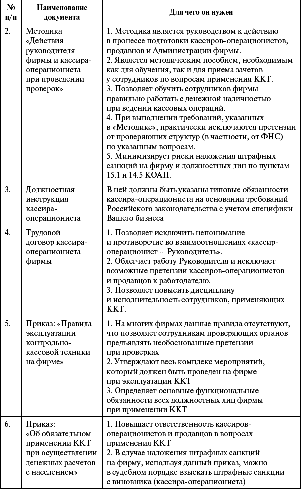 Указанные документы должны быть у Вас для обеспечения деятельности фирмы. Они также незаменимы при обучении и подготовке сотрудников к работе на ККТ при осуществлении денежных расчетов с населением и работе с денежной наличностью. Также наличие данных документов поможет любому Руководителю заранее подготовить всех своих сотрудников к любым возможным проверкам со стороны ФНС, полиции и других проверяющих органов.