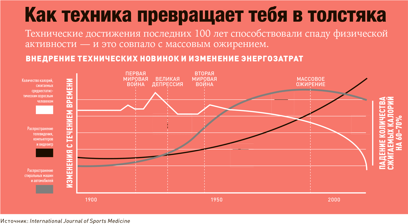 В наше время физические упражнения критически важны для сохранения здоровья. Как ни верти статистикой, одно совершенно очевидно: по сравнению с предыдущими поколениями мы ведем намного менее активный образ жизни. Если ты сомневаешься, что двигаешься меньше своего прадеда, ознакомься с расположенной ниже диаграммой, которая показывает значительное снижение количества калорий, сжигаемых людьми за день. Она взята из проведенного в Голландии исследования, в ходе которого физическая активность современных офисных работников сравнивалась с физической активностью людей, имитировавших повседневную жизнь европейских поселенцев в Австралии XIX века. Уровень физической активности участников исторической реконструкции оказался в 1,6 раза выше – как если бы они проходили за день на 8 миль (почти 13 км) больше, чем современный офисный работник. Исследователи опубликовали полученные результаты в International Journal of Sports Medicine; они показывают, как на протяжении последних 100 лет технические новинки – например, стиральные машины и автомобили – способствовали спаду физической активности, совпавшему с эпидемией ожирения.