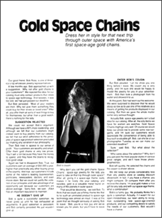 Текст: Наш хороший друг Боб Росс – представитель одного из крупнейших в Америке оптовых продавцов ювелирных изделий. Несколько месяцев назад Боб обратился к нам с идеей: «Почему бы вам не предложить своим клиентам золотые цепочки?» Идею мы отвергли, так как наш каталог должен представлять только товары, связанные с технологиями космической эры. Да и, кроме всего прочего, было уже слишком поздно – крайний срок подачи материалов уже прошел.