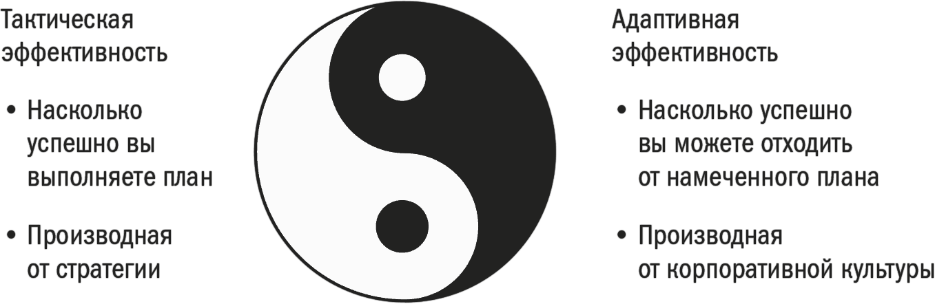 Культура и стратегия, взятые вместе, а также их результаты – адаптивная и тактическая эффективности – похожи на инь и ян. Их также можно назвать двумя половинками целого, и каждая из них по-своему значима для деятельности человека и компании.