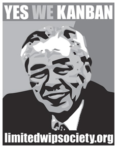 Чтобы подчеркнуть этот выбор, я разработал дизайн футболки для Общества ограничения незавершенных задач. Я вдохновился постером Шепарда Фэйри для предвыборной кампании Обамы, на который поместил портрет Тайити Оно, создателя канбан-системы в Toyota. Слоган «Да, мы за канбан» призван подчеркнуть, что у вас есть возможность. Вам разрешается попробовать Канбан, модифицировать свои процессы, быть другими. Ваша ситуация уникальна, и вы можете разработать собственное решение для своего процесса, оптимизированное для вашей сферы деятельности и потока создания ценности, рисков, с которыми вы сталкиваетесь, навыков вашей команды и требований ваших клиентов.