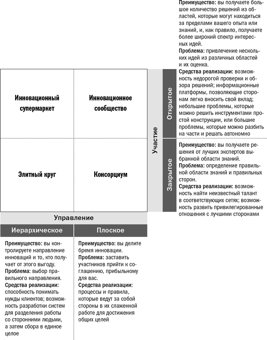 Есть два основных вопроса, которые руководители должны учитывать, решая, как строить сотрудничество по данному инновационному проекту. Членство в сети должно быть открытым или закрытым? И какой должна быть структура управления сетью для выбора проблем и решений: плоской или иерархической? В этой таблице представлены четыре основных варианта сотрудничества.