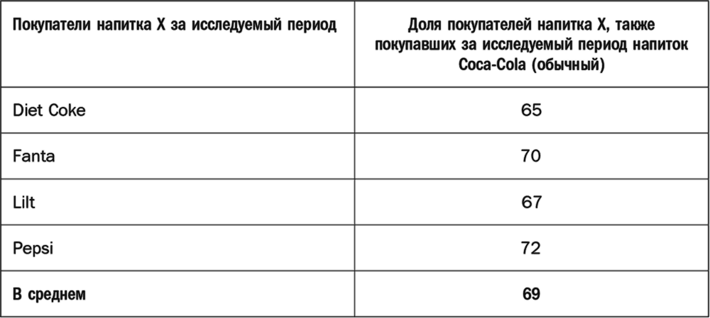 Данные табл. 6.1 показывают, что различные бренды безалкогольных напитков имеют в чем-то общую потребительскую базу с компанией Coca-Cola, то есть показано, какая доля клиентов каждого безалкогольного бренда в исследуемый период покупала также и Coca-Cola. Эти данные потребительской панели Impulse (Великобритания), представленные TNS, я отобрал специально, поскольку они относятся к индивидуальным покупателям, приобретавшим напитки для личного потребления. Таким образом, отраженный в таблице ассортимент покупок обусловлен абсолютно не тем, что разные люди из одного и того же домохозяйства покупают разные бренды.