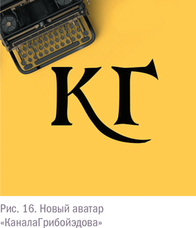 3. Аббревиатура – тоже популярный вариант. У «КаналаГрибойэдова» именно такой аватар – КГ. В этом есть небольшая самоирония и игра слов: пользователь сети со стажем должен помнить, что такое «КГ/АМ». Выполнен наш аватар в желто-черных тонах: такое сочетание цветов привлекает внимание (небольшой чит-код из мира рекламы). Отмечу, что это действительно работает – аватар прост, понятен и не вызывает вопросов.