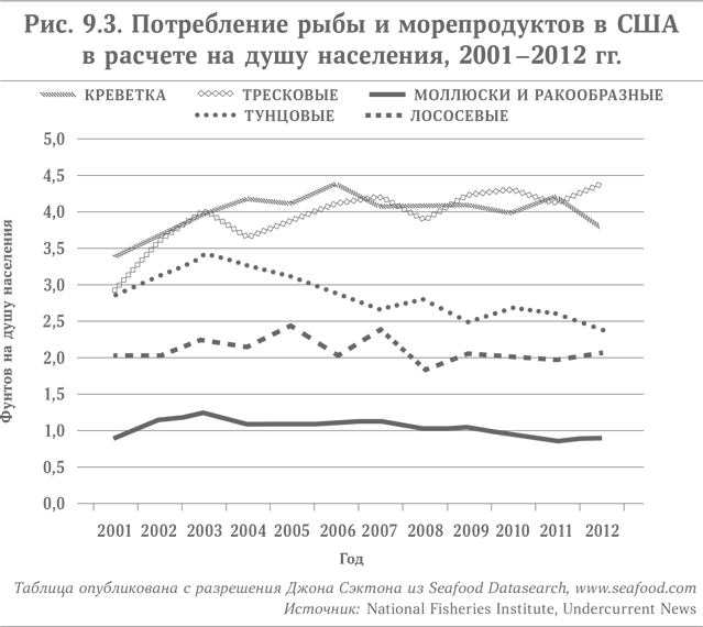 Удивительно, но на протяжении нескольких последних десятилетий одной из жертв протеиновой лихорадки были тунцовые. В принципе, власти предупреждали только о возможном вреде тунцовых для беременных в связи с повышенным содержанием ртути, и это касалось только длинноперого тунца. (Уровень рН светлого тунца не позволяет накапливать ртуть в значимых количествах.) Однако, несмотря на свою дешевизну и пользу для сердечно-сосудистой системы, в XXI в. тунец оказался в числе потерпевших крупное поражение.