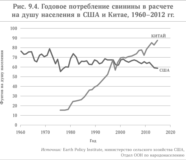 Взрывной рост пищевого производства ожидается в Китае и Индии. По потреблению свинины на душу населения Китай уже опережает США, и, возможно, по этой причине в 2013 г. крупнейшая китайская мясоперерабатывающая компания Shuanghui International купила американский бренд Smithfield за $4,7 млрд. По душевому потреблению других видов белковых продуктов, например куриного мяса, Китай отстает от США. Но потребление курицы в Китае устойчиво растет, а размеры рынка таковы, что до насыщения ему еще очень далеко. В Индии также едят больше куриного мяса, чем когда-либо прежде. В 2014 г. индийское государственное бюро выборочных обследований сообщало, что ежегодный прирост потребления курятины в стране составляет 12 %, что делает ее рынок одним из самых перспективных.