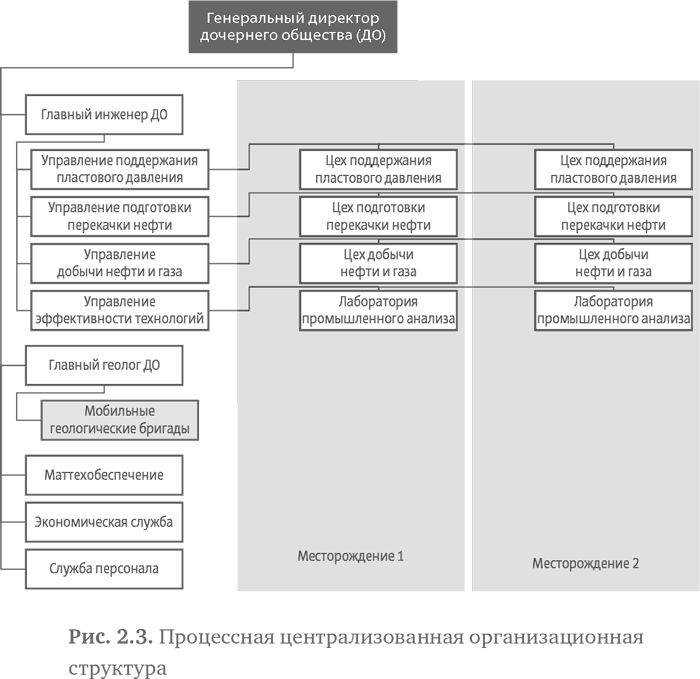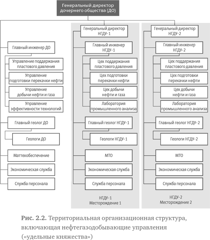 Российские нефтяные холдинги состоят из головной компании и производственных предприятий, в том числе добывающих. Добывающие предприятия, как правило, ведут операции на нескольких месторождениях в одном регионе. Традиционно для эксплуатации каждого месторождения создается своя территориальная структура – нефтегазодобывающее управление (НГДУ).