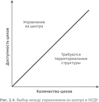 После долгого обсуждения участники пришли к консенсусу. Мы составили матрицу, которая позволяла принимать решения о целесообразности НГДУ в каждом конкретном случае (рис. 2.4). На горизонтальной оси находится количество цехов на предприятии: чем больше цехов одного типа, тем выше целесообразность НГДУ, что объясняется нормой управляемости. Вертикальная ось отражает доступность месторождения из администрации предприятия – здесь учитывается и расстояние до месторождения, и состояние дорог, и наличие и качество телефонной и интернет-связи. На практике встречаются месторождения, до которых через тайгу на машине можно проехать только зимой по замерзшим болотам, а связаться можно только по рации, – очевидно, что на таких месторождениях не обойтись без территориальной управляющей структуры, включающей технологов, геологов и единого начальника. Если же доступность месторождения хорошая и с точки зрения дорог, и с точки зрения связи, то можно управлять цехами из центра. Очевидно также, что если цехов мало, то говорить о территориальных структурах нет смысла.