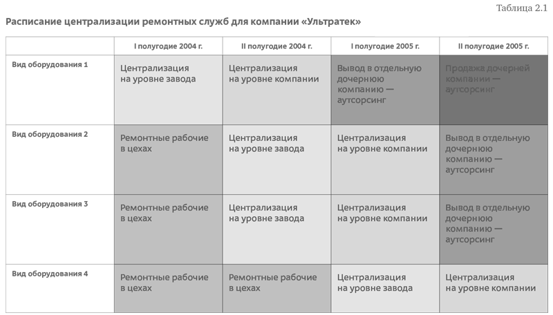 Мы составили расписание централизации и вывода ремонтов в аутсорсинг (табл. 2.1).