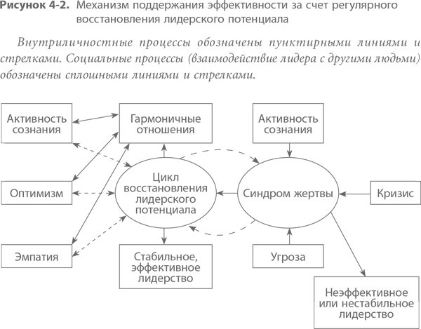 Восстановление лидерского потенциала – это процесс, в ходе которого залечиваются психологические раны, полученные под воздействием постоянных стрессов. Он, как показано на рис. 4–2, носит двунаправленный характер: с одной стороны, активное сознание, оптимизм и эмпатия помогают человеку восстановиться, с другой – возникающее при этом чувство душевного обновления, в свою очередь, стимулирует развитие этих трех качеств{60}. Итак, чтобы противостоять синдрому жертвы, нужно: сохранять оптимизм даже в самых трудных обстоятельствах; искренне заботиться о подчиненных и уметь сопереживать им; внимательно анализировать свое физическое и эмоциональное состояние, а также тонко улавливать чувства других людей.