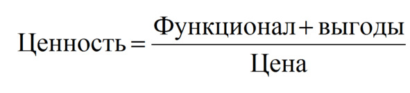 Можно посчитать количество функций и выгод, цену взять неким условным коэффициентом, чтобы, изменяя или сравнивая его с конкурентами, оценивать результат. Давайте прикинем, что получится. Допустим, выгод и ценностей по три, а цена равна неким двум условным единицам: