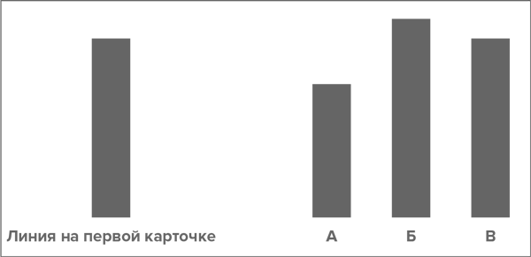 В одних ситуациях мы доверяем суждению толпы, а в других обращаем внимание не на ее мудрость, а на социальное давление. Мы начинаем обращать внимание, потому что должны. Возможно, вы слышали об экспериментах Аша в области конформизма. В 1950-х гг. польско-американский психолог Соломон Аш провел серию экспериментов в области конформизма, ставших классическими. В типичном эксперименте Аша одного испытуемого (обычно студента колледжа мужского пола) помещали в комнату, где находилось 5–10 других студентов – на самом деле актеров – и просили принять участие в выполнении задания на восприятие. Группе показывали карточку с вертикальной линией, а затем вторую с тремя линиями разной длины, обозначенными буквами А, В и С. Всех испытуемых просили сказать вслух, какая из линий, А, В или С, была такой же длины, что и на первой карточке{150}.