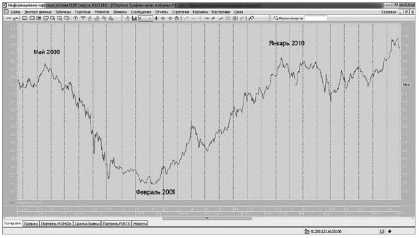 Динамика котировок акций Сбербанка с мая 2008 года по ноябрь 2010 года