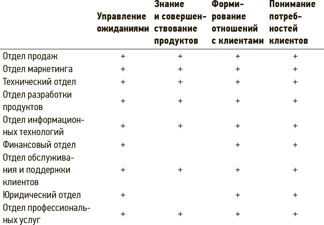 Обратите внимание: все организационные единицы компании несут ответственность за управление ожиданиями, знание продуктов, формирование отношений с клиентами и понимание их потребностей. Исключение составляют только финансовый и юридический отделы, что вполне логично. В остальных случаях ответственность за приоритетные задачи возложена как на подразделения, взаимодействующие с клиентами, так и на те, что не вступают с ними в непосредственный контакт. Другими словами, в FileNet каждый отдел играл определенную роль в улучшении клиентского опыта и был заинтересован в успешной реализации программы.