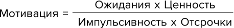 Поэтому в уравнении и появился знаменатель, учитывающий эффект, который время оказывает на нашу мотивацию. Чем дольше приходится ждать поощрения за работу, тем меньше у нас желания что-либо делать. Отрицательный эффект от промедления усиливается за счет нашей импульсивности. Мотивация очень импульсивных людей страдает от любой задержки.