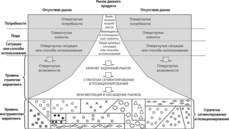 Маркетинговый процесс – это последовательность шагов (см. рис. 2.7). Он начинается с идентификации потребностей с целью выявления людей/ситуаций, которые становятся нашим потенциальным рынком. После того, как рынок определен, он далее считается фиксированным и неизменным. Этот подход позволяет установить рамки конкурентной борьбы и отслеживать ключевые показатели эффективности по данному рынку (или категории) – размер, разнообразие, долю, принадлежащую компании. На основе определения рынка принимаются стратегические решения в отношении сегментирования, задания целевой группы и позиционирования, а эти решения, в свою очередь, становятся базой для формирования тактического инструментария маркетинга. В действительности практическое сегментирование возможно лишь в контексте рынка, который был определен заранее. Многократное сегментирование рынков приводит к их чрезмерной фрагментации, что снижает шансы успешного вывода на рынок новых товаров. Модель рынка, в которой он представляется фиксированным, чрезвычайно полезна, однако не позволяет увидеть (и, как следствие, реализовать) определенные возможности инноваций.