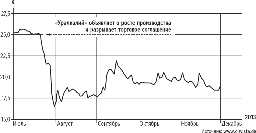 На глобальном рынке поташа – соединения калия, важной добавки для удобрений – тихо и мирно доминировали всего три компании: российское ПАО «Уралкалий», канадская Potash Corp. и немецкая K+S. Цены были относительно стабильными и составляли около $400 за тонну. Однако ситуация изменилась в конце июля 2013 года, когда «Уралкалий» объявил о трех решениях, которые разорвали «неофициальный картель» и обрушили курс акций. В соответствии с новой стратегией «продажи важнее цен»,[234] «Уралкалий» объявил, что собирается увеличить объем производства на 30 % в следующем году, предложить выгодные цены Китаю (одному из крупнейших в мире потребителей поташа) и разорвать соглашение о совместных продажах со своим белорусским партнером.[235]