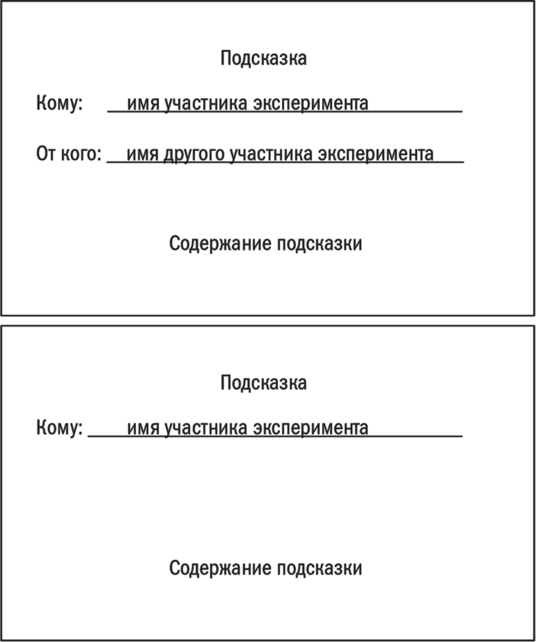 В ходе эксперимента каждый участник получил подсказку на листке бумаги. И вот что самое интересное: у половины из них на листке была только подсказка и название проблемы. Давайте назовем их «группа с нейтральной подсказкой». У другой же половины листик содержал еще имя человека, якобы пославшего подсказку. Назовем их «группа с дружеской подсказкой». Записки выглядели примерно так, как на рис. 19.