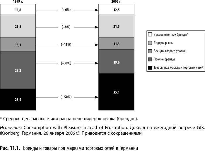 Более того, компании считают нерентабельным выделять менее крупным брендам даже минимум ресурсов, необходимых для инноваций и рекламы. В результате бренды, занимающие меньшую долю рынка, приносят жалкие прибыли и бесперспективны, если только это не нишевые, высококлассные бренды. Германия – очень хороший пример, убедительно демонстрирующий феномен вытеснения менее значимых брендов на фоне новых успехов товаров под марками торговых сетей (рис. 11.1).