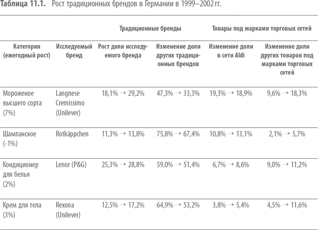 Данные, приведенные на рис. 11.1, были проанализированы в исследовании группы GfK. Это исследование позволило выделить случаи, когда доля рынка того или иного бренда производителя в той или иной категории товаров все же выросла. Несколько таких примеров имели место в 1999–2002 гг., но особенно важно, что прирост доли рынка для бренда производителя происходил за счет брендов других производителей, а не за счет товаров под марками торговых сетей. В табл. 11.1 приведены данные по четырем таким брендам. Производители этих брендов, добиваясь роста своей доли рынка, следовали разным стратегиям. Чтобы поднять имидж мороженого Langnese Cremissimo, была разработана специальная прозрачная упаковка, которая позволяет показать новые экзотические наполнители – изысканные фрукты. Шампанское Rotk?ppchen (переводится как «Красная шапочка») стало более активно заявлять о себе – интенсивная реклама позволила познакомить с товаром больше семей и охватить районы страны, где марка до недавних пор была недостаточно известна. Производители кондиционера для белья Lenor и крема Rexona снизили цены на 17 и 7 % соответственно, чтобы выдержать конкуренцию с товарами под марками торговых сетей. В табл. 11.1 видно, что в каждом случае теряли свою долю рынка именно менее сильные бренды других производителей, а марки торговых сетей в этих категориях товаров только увеличивали свою долю рынка.