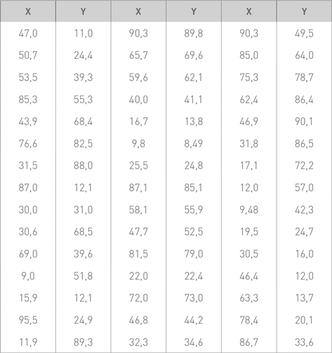 Невероятно популярные книги Эдварда Тафти по визуализации информации наглядно доказывают силу образов в понимании хаоса. Тафти известен своим примером о том, как неверно отображенная информация привела к гибели космического шаттла в 1986 г. Умение извлечь смысл из простой картинки — исключительно важно. Рассмотрим пример из 90 порций информации, которые на первый взгляд не отвечают никакой определенной закономерности (см. таблицу).